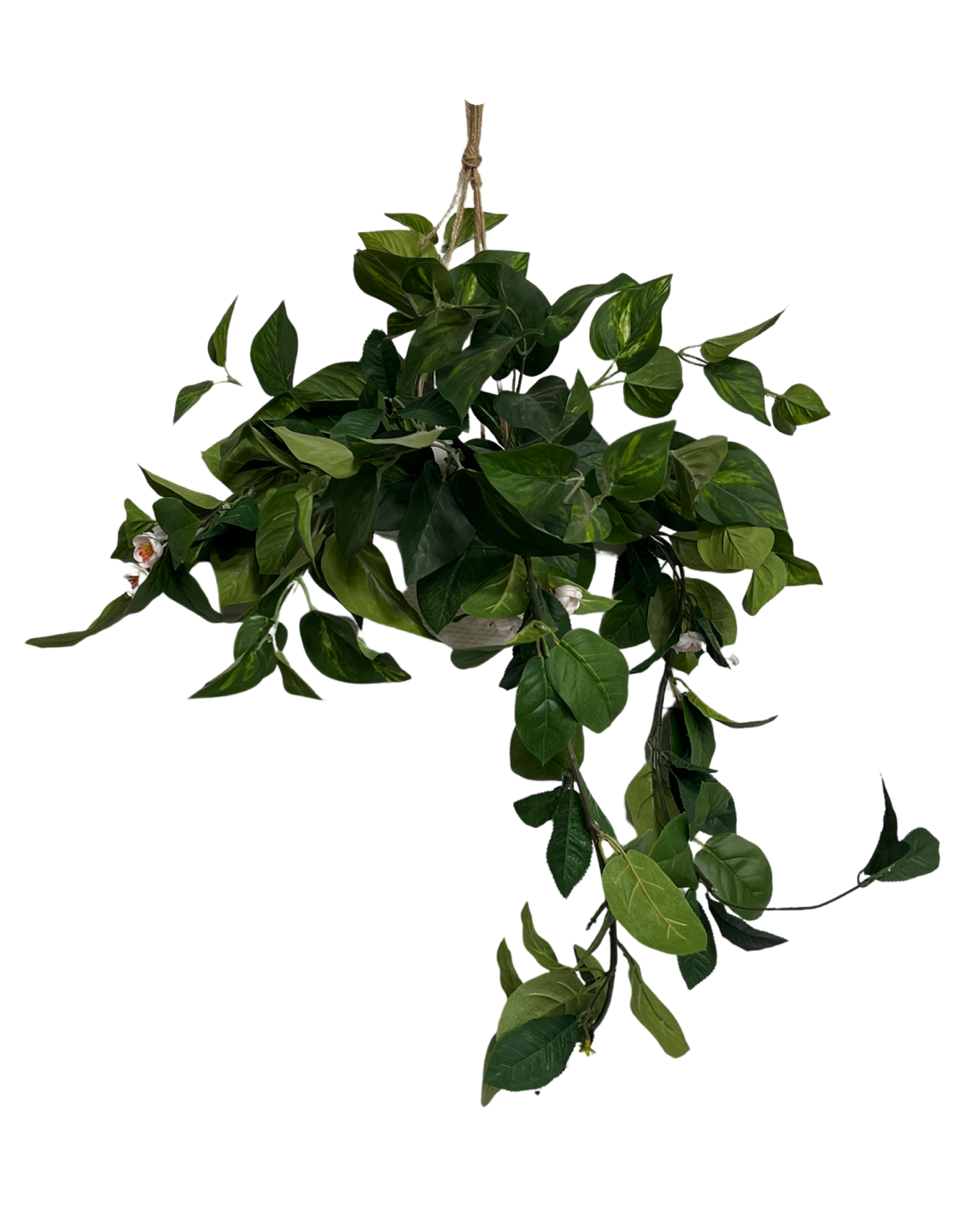 Variegated Pothos With White Flowers In Hanging Pot. Plant Hangs 33″.